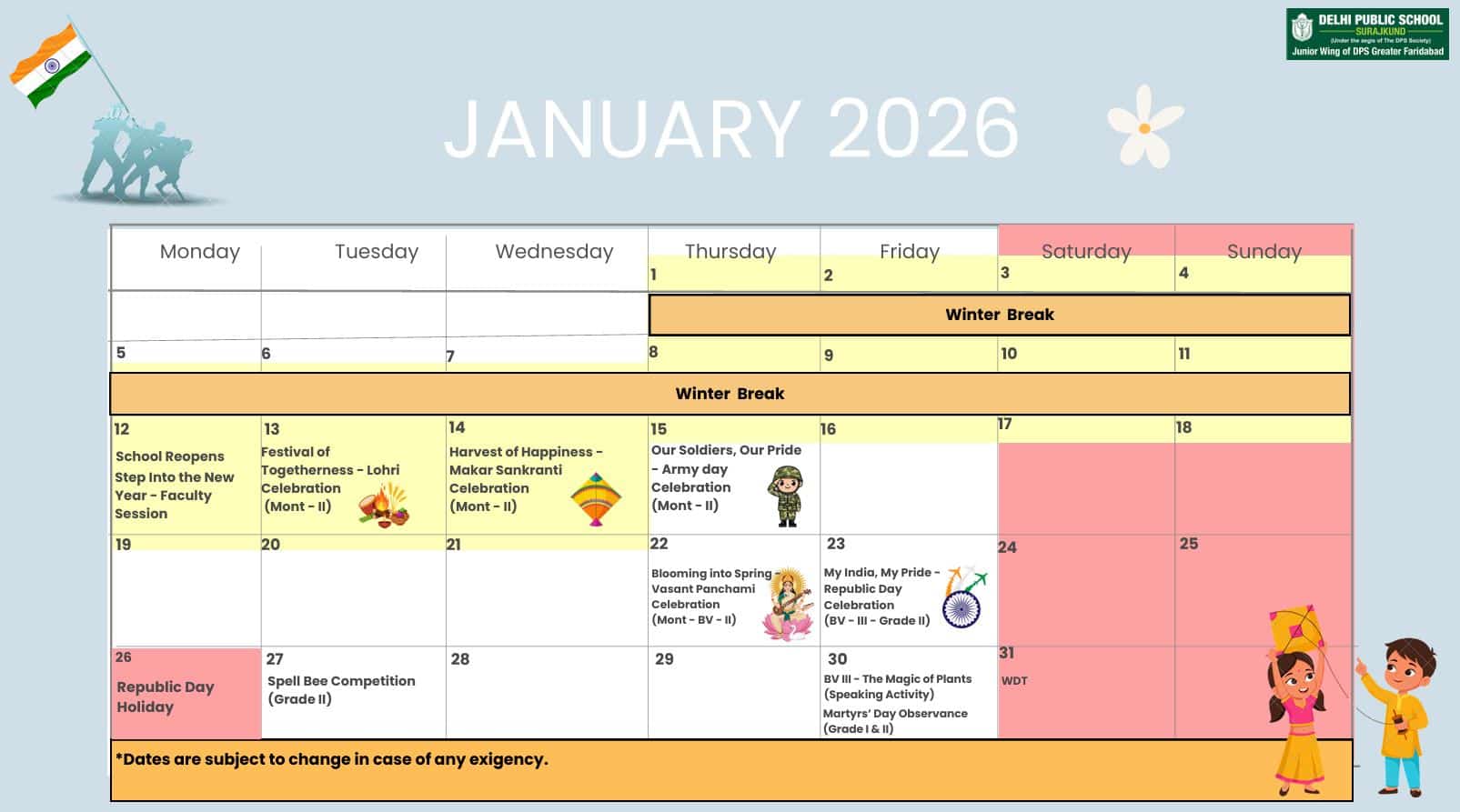 Delhi Public School, Surajkund is a happy and progressive pre-primary school that offers child-centric education based on experiential learning. The school is a junior wing of DPS Greater Faridabad, Sector-81, which is spread over a sprawling and attractive campus. The future we envision for each student is of their becoming a conscientious world citizen, a learner for life and a creative, connected and collaborative problem solver. The Dipsites learn to look at the world from many different perspectives, through the amalgamation of different subjects integrated together and through the context of real world interests, needs and challenges.. At DPS Surajkund, we believe that every child is unique and we nurture that uniqueness through a stimulating environment that breeds curiosity, freedom and encouragement to pursue passion and practice of self-reflection. Further, the journey of exploration and learning will be enhanced and continued at DPS Greater Faridabad, Sector-81 after the completion of Class-II.